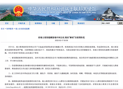 为保证旅瑞中国公民的健康安全,驻瑞士使馆再次提醒全体旅瑞侨胞、学生学者和中资机构人员注意以下事项: