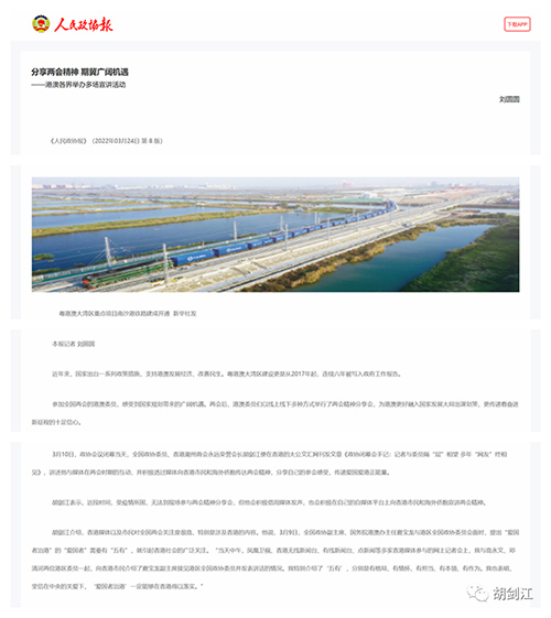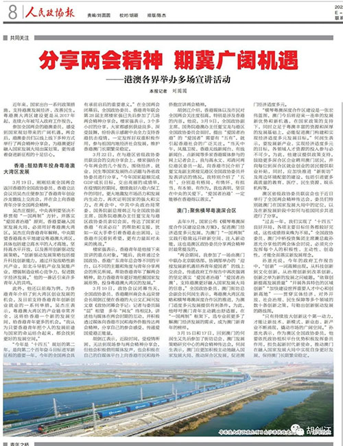 3月24日出版的人民政协报刊发文章《分享两会精神 期冀广阔机遇——港澳各界举办多场宣讲活动》,港区全国政协委员接受采访,通过媒体向香港市民分享全国两会精神,传递奋进新征程的十足信心。