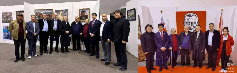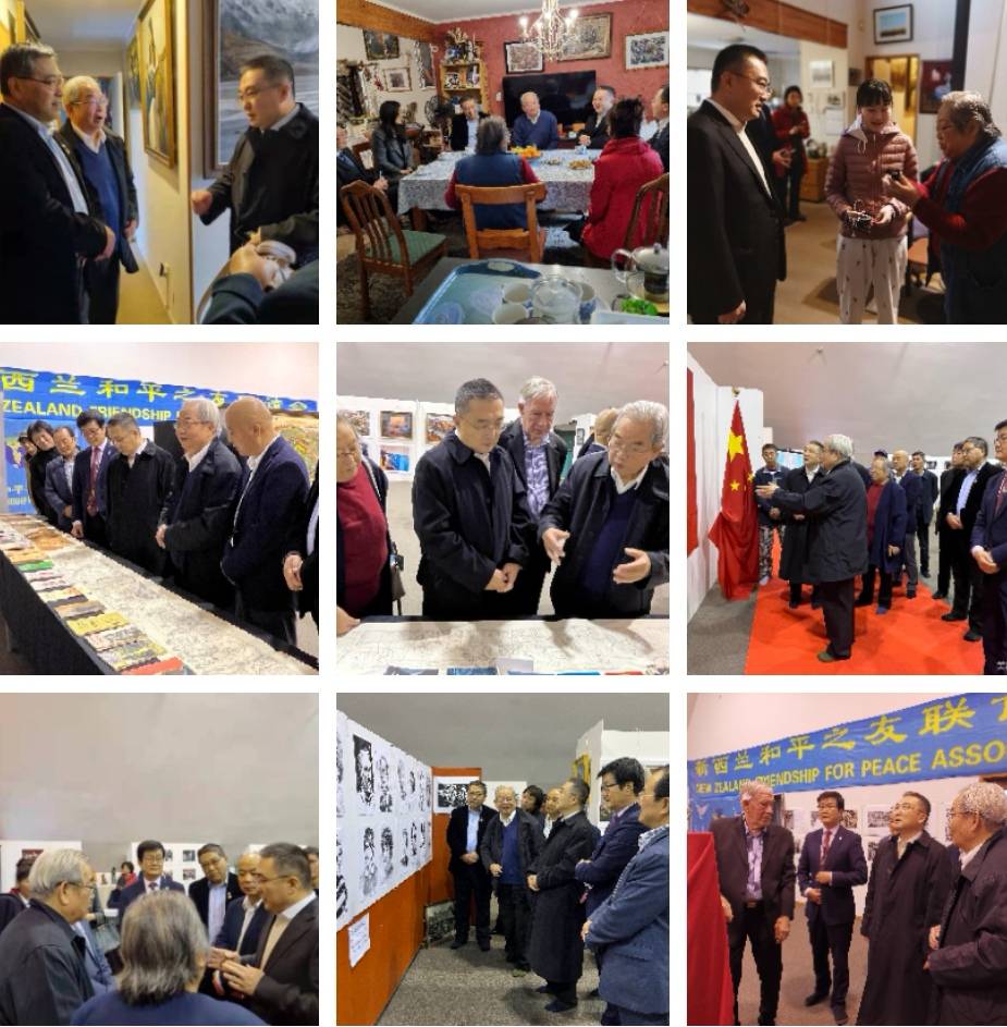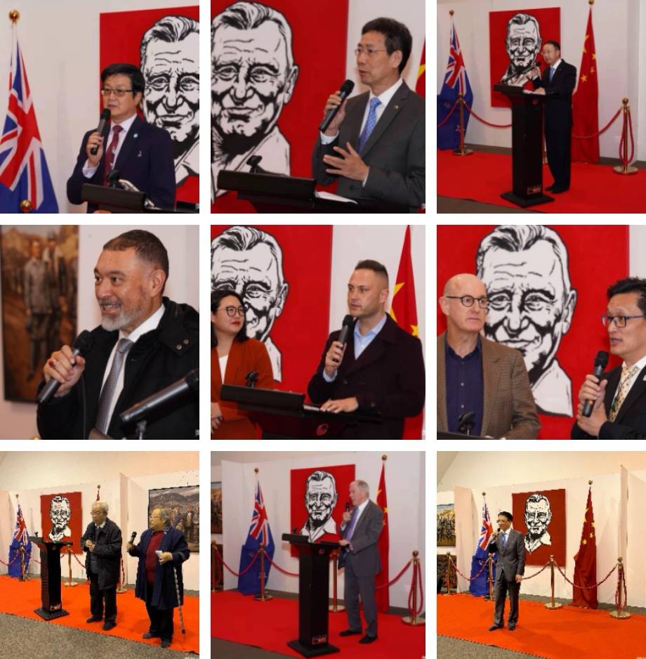 新西兰和平之友联谊会会长乔治兵,中国驻奥克兰总领事馆总领事阮平,中国驻新西兰大使馆教育参赞董志学,国会议员陈耐思, 国会议员Shanan Halbert. 奥克兰市议员杨宗泽, 市议员Chris Darby, 毛利酋长Anthony, 新中友协奥克兰分会主席Michael Hart, 策展人邓邦镇教授和卢波教授,新西兰文化艺术基金会主席饶金生到会祝贺并剪彩。