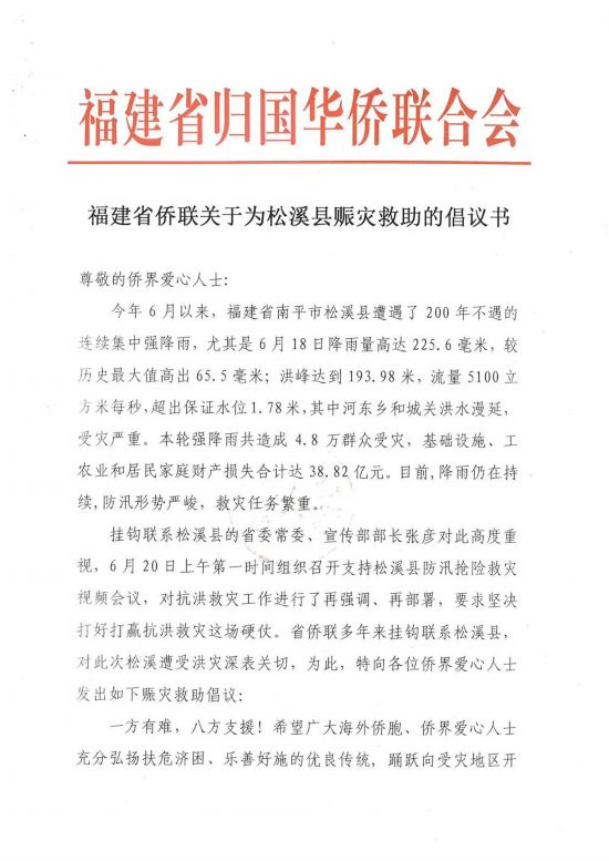 五、突出抓岗位奉献。6月底以来,面对松溪县历史罕见的暴雨灾情,第一时间发出“为松溪县赈灾捐赠的倡议”,引导省海外杰出女性联谊会、益海嘉里集团、希腊闽商总商会、菲律宾乐善堂慈善基金会、“嘉庚精神”研修班学员等伸出援助之手,共捐款捐物近200万元。有序推进“党旗在飘扬、侨界新贡献”行动、侨家乐·福建省华侨美食风情文化节等,营造干事创业的良好氛围。
