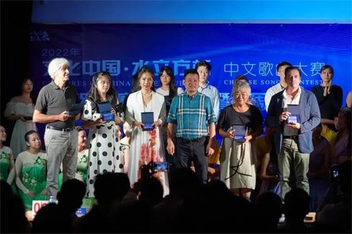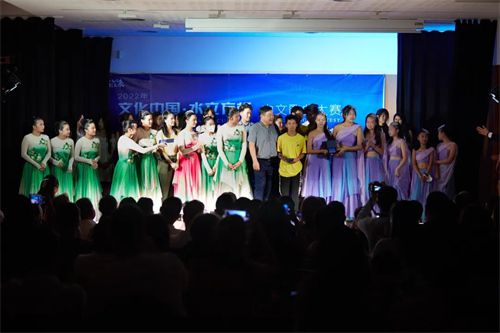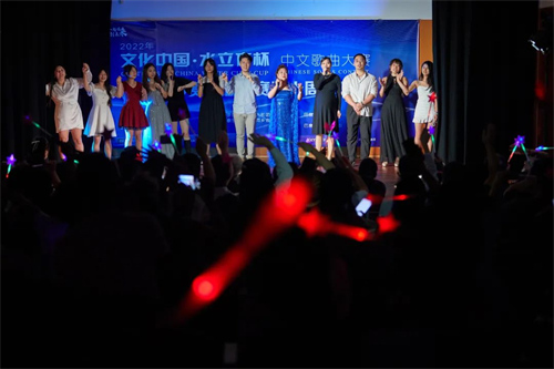 接下来陆慈君副总领事,韦龙宇领事,李培华院长,张晓荣主席,许建南主席,林峰主席,陈庸光主任,周志文会长,韩杰会长,金浩会长,周建虹会长,沈岱曦会长,陈淑芬团长,张建新会长,陈永义会长,杨卫会长,关捷主席,叶晓红会长,陈康年会长,姜吉隆会长,周优统会长,周永伟主席,丁国峰会长,林涵会长,陈亚珍会长,叶正荣主席,徐向宏主席,赵均锋会长还有其他三位评委老师等众嘉宾合唱了一首《我和我的祖国》。
