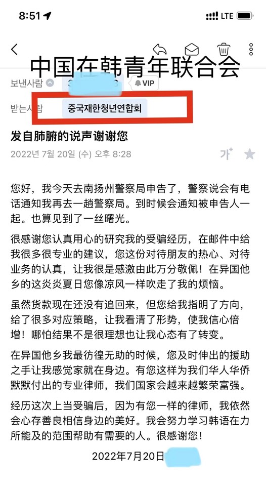 2022年7月20日,人民法院调解平台侨联系统中的海外调解组织中国在韩青年联合会公益维权委员会官方邮箱收到一封来自侨胞的感谢信。信中写到,“发自肺腑的说声谢谢您……很感谢您认真用心的研究我的受骗经历,在邮件中给我很多很专业的建议,您这份对待朋友的热心、对待业务的认真,让我很是感激由此万分敬佩!在异国他乡的这炎炎夏日您像凉风一样吹走了我的烦恼……在异国他乡我最彷徨无助的时候,您及时伸出的援助之手让我感觉家就在身边。”