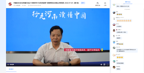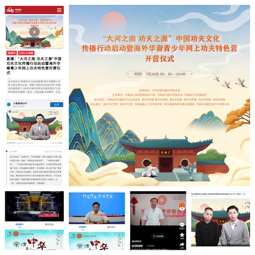 省侨联二级巡视员刘合生,省文旅厅党组成员、副厅长李延庆代表主办方向全球发出了“体验功夫文化,云游大美河南”的诚挚邀请。来自美国、加拿大、法国、西班牙、泰国等15个国家和地区的海外华侨华人社团、华文学校代表、华裔青少年代表及海内外功夫爱好者5000余人云聚线上观看,近千名海外华裔青少年报名参加网上营活动。启动仪式以线上形式举办,通过大象新闻、映象网等新闻媒体平台及视频号、抖音、微赞等网络平台进行直播,河南省文旅厅相关新媒体平台同步直播。