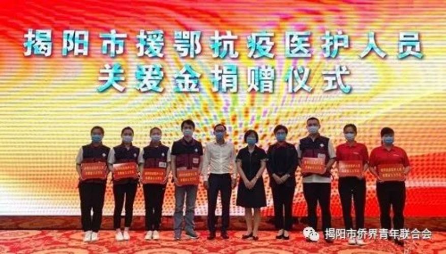 自疫情以来,揭阳市各级侨联组织主动作为,积极对接动员海外侨胞捐赠抗疫物资,支援家乡抗疫。组织海外侨胞、港澳台同胞捐赠医用一次性口罩、医用检查手套、抗菌液、电子测温计等一大批抗疫急需医用物资。积极协助省侨联、仁爱基金会开展海内外侨胞捐赠、采购短缺医疗物资的对接服务,共协助25个海内外社团对接98个受赠单位。揭阳市侨联承办举行海外侨胞捐赠揭阳市援鄂医护人员关爱金发放仪式,由美国潮商总会和北京潮人海外联谊会通过广东省侨界仁爱基金会捐赠72.6万元,为揭阳市22名援鄂医疗队员每人发放关爱金3.3万元。