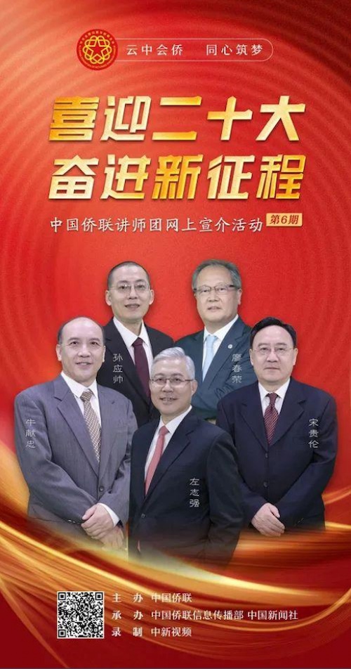 8月26日,以“喜迎二十大奋进新征程”为主题的中国侨联讲师团(第六期)网上宣介视频正式上线。视频旨在深入学习贯彻习近平新时代中国特色社会主义思想,深刻领会“两个确立”的决定性意义,增强“四个意识”、坚定“四个自信”、做到“两个维护”,进一步发扬历史主动精神、弘扬优良传统,进一步凝聚侨心侨力侨智,踔厉奋发、笃行不怠。以更加优异的成绩迎接党的二十大胜利召开。