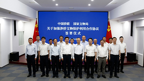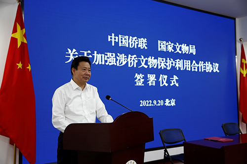 9月20日,中国侨联与国家文物局在京签署《关于加强涉侨文物保护利用合作协议》。中国侨联党组书记、主席万立骏,文化和旅游部副部长、国家文物局局长李群出席签署仪式并讲话。中国侨联党组成员、副主席候选人连小敏,国家文物局副局长顾玉才分别代表双方签署协议。