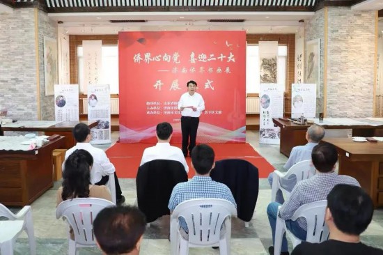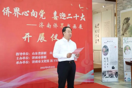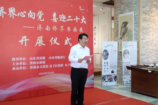 为讴歌党的辉煌历程,弘扬新时代精神,广泛凝聚侨心侨智侨力,团结引领广大侨界群众听党话、感党恩、跟党走,以昂扬奋进的姿态喜迎党的二十大胜利召开,9月23日上午,在山东省侨联、省财政厅的指导支持下,由济南市侨联主办,市文化馆、历下区侨联、历下区文联联合承办的“侨界心向党 喜迎二十大”济南侨界书画展在山东省文化馆开幕。中国侨联兼职副主席、山东省侨联党组书记、主席李兴钰,历下区委常委、组织部部长、统战部部长徐法贤,侨界书画家代表、印尼归侨吕志孔出席开幕式并分别致辞。山东省财政厅一级巡视员孙庆国出席开幕式。济南市侨联党组书记、主席米文芃主持仪式。