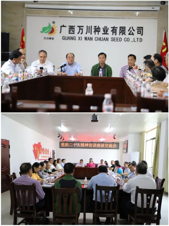 期间,在广西万川种业有限公司会议室召开的党的二十大精神宣讲座谈会上,自治区侨联党组成员、秘书长、经济科技部部长李开伟以领学形式,带领党员学习了党的二十大精神,并要求全体党员要深刻领会党的二十大精神的丰富内涵,领会报告提出的一系列新观点、新思想、新战略和新要求,深刻把握新时代新征程的使命任务,紧紧围绕党的二十大精神来研究、谋划、推进各项工作,结合侨联工作特色、优势,踔厉奋发,勇毅前行,奋力为建设中国式现代化贡献侨界力量。会上,党员们分享了学习二十大报告的体会心得,表达对党的心声。交流以党建带侨建、党建与侨企融合的新方法,形成了互学互促、以学促悟的良好学习氛围。