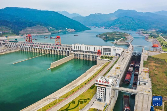 建设中的广西大藤峡水利枢纽工程和已经投入使用的船闸(2022年9月29日摄,无人机照片)。新华社记者 曹祎铭 摄