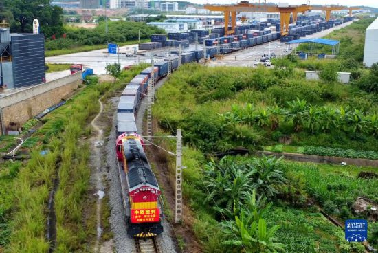 搭载2600吨白糖的中欧班列从南宁国际铁路港出发驶向哈萨克斯坦阿拉木图(2022年5月15日摄,无人机照片)。新华社记者 张爱林 摄