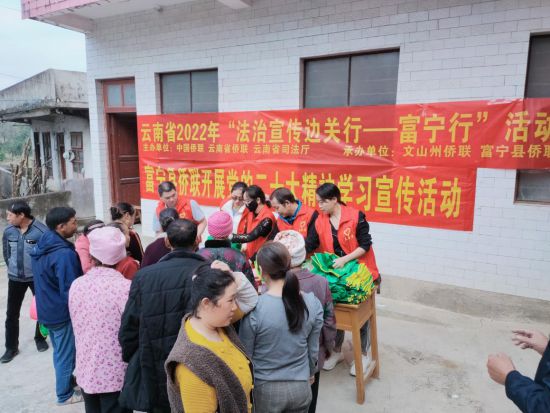 活动中,富宁县侨联根据边境村寨实际,结合边境小康村建设和绿美乡村建设情况,将党的二十大精神要义精心梳理印制成群众“看得懂、听得进、用得上”的宣传品,通过摆设宣传摊点、悬挂宣传横幅、发放宣传品以及现场宣讲等多种形式,对党的二十大报告精神进行阐述和解读,让边境群众详细了解党的二十大精神。