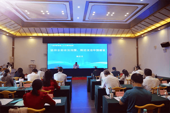11月17日,自治区侨联在我市召开党的二十大精神宣讲会,自治区侨联副主席(兼)、玉林市侨联主席杨志光作题为《坚持全面依法治国,推进法治中国建设》的党的二十大精神宣讲