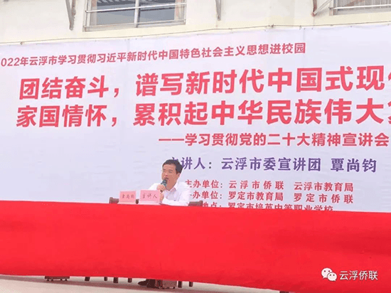 宣讲会上,云浮市委宣讲团成员、云浮市侨联党组成员、副主席覃尚钧围绕“团结奋斗,谱写新时代中国式现代化崭新篇章;家国情怀,累积起中华民族伟大复兴的中国梦”宣讲主题,结合党的二十大报告提出的新思想、新论断、新要求、新战略等方面,联系学生的学习和生活实际,及当前国内国际形势,以通俗易懂的语言,宣传党的二十大精神。“我们要坚定不移听党话、感党恩、跟党走,努力学习,增强本领,争做有理想、敢担当,能吃苦、肯奋斗的新时代好青年。”罗定市培英中等职业学校学生纷纷表示。