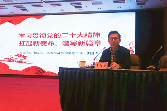 刘标指出,李国华同志的宣讲报告视野开阔、分析透彻,旁征博引、内涵丰富,对于全省侨界干部群众深入学习贯彻党的二十大精神是有力的指导和促进。学习宣传贯彻党的二十大精神是当前和今后一个时期的首要政治任务,全省各级侨联和广大侨界群众要在全面学习、深刻领会上下功夫,切实把思想和行动统一到党的二十大精神上来,确保侨联工作始终沿着党指引的方向前进,大力弘扬侨心向党的优良传统,踔厉奋发、勇毅前行、团结奋斗,在伟大复兴的新征程上开创更加美好未来。要在宣传阐释、凝心聚力上下功夫,采取有侨特色、为侨乐见的方式,深入宣传阐释党的二十大精神,着力增强说服力、亲和力和针对性、有效性。希望广大侨商、侨界专家、新侨、侨界青年尽己所能、扬己所长,努力带动和持续推动侨界资金、高层次人才、先进技术、优质项目等源源不断汇聚江苏,为全面推进中国式现代化江苏新实践作出侨界新贡献。要在守正创新、提质增效上下功夫,把学习贯彻党的二十大精神与学习贯彻习近平总书记关于群团工作和侨务工作的重要论述结合起来,切实把学习成果转化为推动侨联工作的新思路、新举措,立足职能定位,发挥独特优势,在新征程上奋力开创江苏侨联事业新局面。