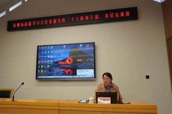 此次培训内容丰富,苏州市侨联党组书记、主席李文辉以“学习贯彻党的二十大精神,推进新时代侨联事业高质量发展”为主题作了专题辅导;市侨联党组成员、四级调研员张俊森传达《关于全省侨联系统认真学习宣传贯彻党的二十大精神的通知》文件精神;党的二十大代表马瑜婷博士作了二十大精神的专题宣讲;苏州大学教授就科技前沿发展、经济形势分析及管理沟通语言艺术等相关内容开展专题授课。各市、区、高校、科研院所侨联专兼职干部,苏州市侨联委员,侨界社团组织负责人等共50人参加培训。