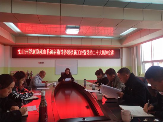 在砚山县侨联,州侨联副主席彭艳娜以侨务工作为切入点进行宣讲,并要求:一是要对标对表,接好天线。按照党的二十大提出的“加强和改进侨务工作,形成共同致力民族复兴的强大力量”要求,深入思考如何把党中央的关心重视转化为真抓实干、锐意创新的实际行动。二是要摸清内情,精准施策。注重工作的方式方法与策略,切实了解侨胞的需求与愿望,突出重点,干在实处,强化政治引领,最大限度凝聚起共同团结奋斗的侨界共识和侨界力量。三是要主动融入大局,助力共同富裕。要坚持“党建带侨建”,夯实组织根基,加强联络联谊,真情服务侨胞,引领侨界群众积极融入发展大局,不断增强幸福感、安全感、获得感。四是要坚持严的基调,提升作风效能。持之以恒推进全面从严治党,牢牢守住侨界风险底线,为侨联事业改革发展行稳致远提供坚强保障。