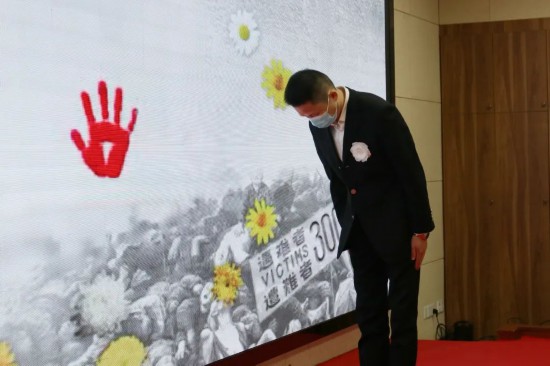 在庄严肃穆的旋律中,全体人员向南京大屠杀死难者敬献菊花,寄托哀思。
