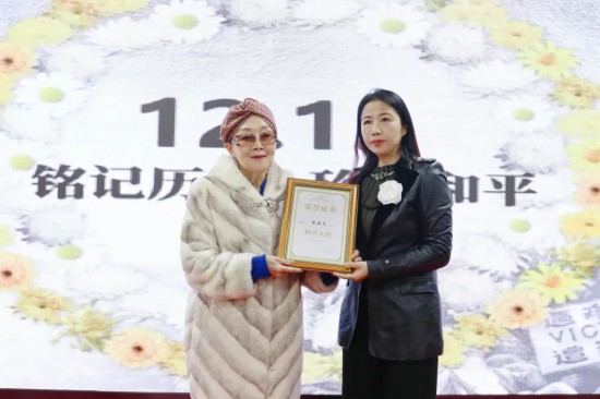 南京市侨联党组书记毛银玲为中国侨联海外顾问张素久颁发“和平大使”荣誉证书。