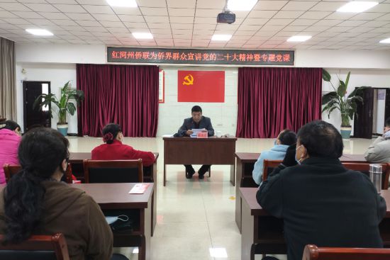 12月14日,云南红河州委统战部副部长、州侨联党组书记李卫东到蒙自市红竺园社区开展党的二十大精神宣讲,侨界群众、州市侨联、社区干部40余人参加活动。