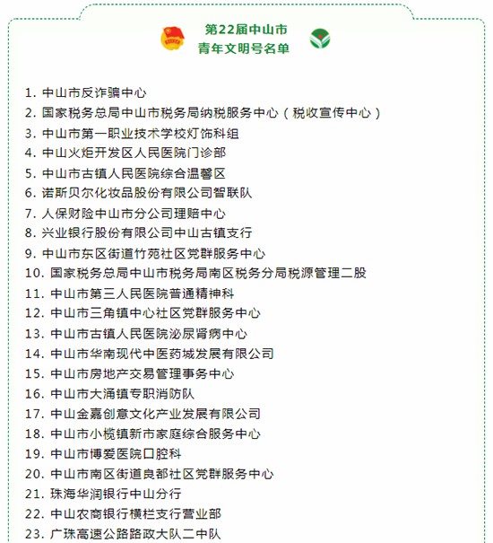 广东省中山市新侨服务中心认定为第22届中山市青年文明号。继荣获省直机关“先锋杯”工作创新大赛全省三等奖后,中山市侨联“党建带侨建”工作再创佳绩。