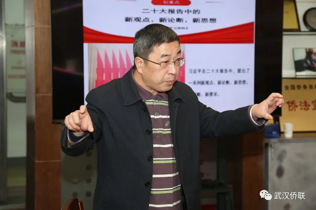 随后,组织大家开展了一堂“学习党的二十大精神,传承中华美德,弘扬孝道文化”课。硚口区人大副主任程宏刚结合自己的学习心得体会,对“二十大报告中的新观点、新论断、新思想”作了全面阐释,让大家对党的二十大的主要精神有了更加深入的了解。结合中华文明悠久历史,从进一步增强文化自信的角度,阐述了中国的孝道文化。他从孝道的内涵,尊老尚齿、天下太平,孝道文化的时代价值等三个方面进行了深入浅出的讲解。大家纷纷表示临近传统佳节,硚口区侨联组织开展“迎新春、送温暖”活动的同时,安排“学习党的二十大精神,传承中华美德,弘扬孝道文化”的讲座很有意义。