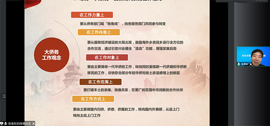 中国华侨华人研究所所长、中国华侨历史学会副会长张春旺同志以《新时代侨联工作的根本遵循学习贯彻习近平总书记关于侨务工作的重要论述》为题作了精彩授课,以丰富的历史史实为基础,系统、全面、深入地论证华侨华人与近代以来实现中华民族伟大复兴的事业紧密相联,党和国家的侨务工作是党史的重要组成部分,也为参训学员分享了学习习近平总书记关于侨务工作的重要论述的体会。
