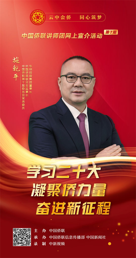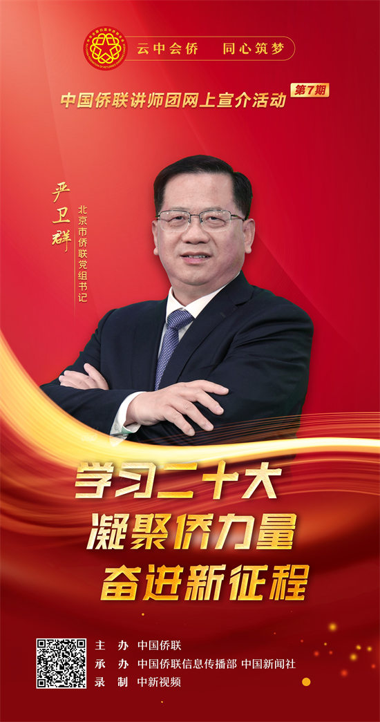 1月18日,以“学习二十大·凝聚侨力量·奋进新征程”为主题的中国侨联讲师团(第七期)网上宣介视频正式上线。视频旨在深入学习贯彻习近平新时代中国特色社会主义思想,深入学习宣传贯彻党的二十大精神,深刻领悟“两个确立”的决定性意义,增强“四个意识”、坚定“四个自信”、做到“两个维护”,进一步加深对习近平新时代中国特色社会主义思想的领悟,加强对马克思主义中国化时代化、中国式现代化、全面从严治党等重大问题的认识,深刻理解党的二十大对全面建设社会主义现代化国家作出的战略部署,在侨界兴起学习宣传贯彻热潮,把思想统一到党的二十大精神上来,把力量凝聚到党的二十大确定的各项任务上来。