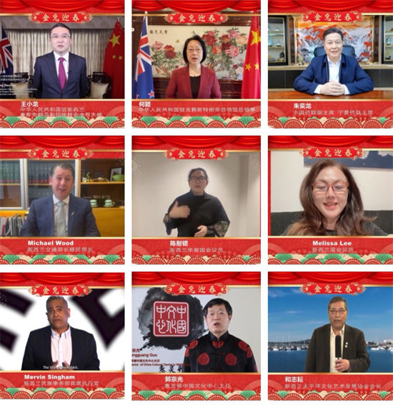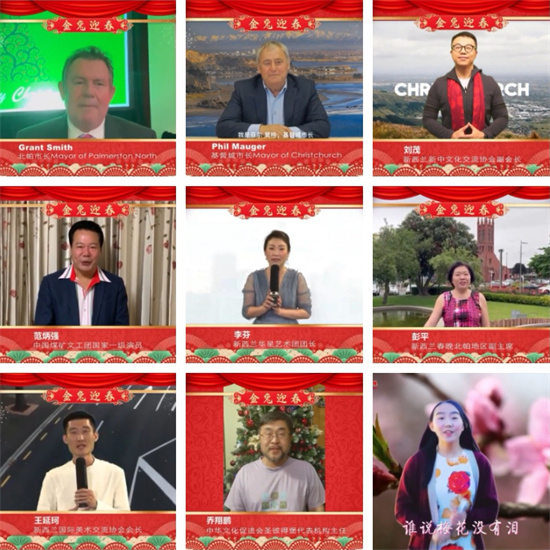 在春晚上中华人民共和国驻新西兰、兼库克群岛和纽埃特命全权大使王小龙阁下,中华人民共和国驻新西兰克赖斯特彻奇总领馆总领事何颖女士,中国侨联副主席、宁夏回族自治区侨联主席朱奕龙先生,以及新西兰交通部部长Hon Michael Wood先生,新西兰华裔国会议员陈耐锶女士,新西兰国会议员Melissa Lee女士,新西兰少数民族事务部首席执行官Mervin Singham先生,基督城市长Phil Mauger先生,旺格雷市长Vince Cocurullo先生,但尼丁市长Jules Radich先生,吉斯本市长Rehette Stoltz女士,北帕市长Grant Smith先生,新西兰华人网络春晚组委会主席/太平洋文化艺术发展协会和志耘会长,新西兰新中友协全国主席Chris Lipscombe先生,基督城发展推广局首席执行官艾莉森·亚当斯女士,以及众多中外朋友都为网络春晚送来了温暖的祝福,并用中文给华人朋友拜年,其乐融融。