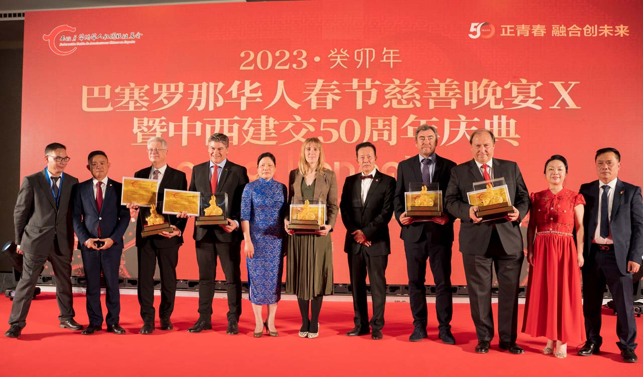 晚宴上,为促进中西关系发展做出突出贡献的机构和个人颁发中西友谊奖,获奖者分别是:1. Victòria Alsina 女士,前加泰罗尼亚自治区外事与政务公开厅厅长,因加强加泰罗尼亚地区与中华人民共和国之间的关系所做的贡献; 2. Antoni Can?ete 先生,加泰罗尼亚中小型企业家协会主席,因一直以来给予华人企业家最大的支持;3. Jose? Manuel Mari?nez-Sierra 先生,庞培法布拉大学巴塞罗那管理学院院长,因为他的杰出的职业生涯以及他在推广跨大洲项目方面的坚持不懈; 4. Josep Franch 先生,ESADE 执行教育主任,因在建立两国高等教育机构之间的持续和巩固关系方面所作出的贡献; 5. Joaquim Lloveras 先生,巴塞罗那大学国际法教授,表彰他为加强中西学生之间的交流做出的贡献。
