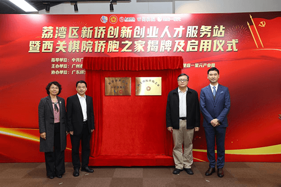 广州市侨联副主席林瑞琪、广州市荔湾区委组织部长黄洪飙、广州市荔湾区侨联主席卜智群、西关棋院院长容一思为荔湾区新侨创新创业人才服务站暨西关棋院侨胞之家揭牌