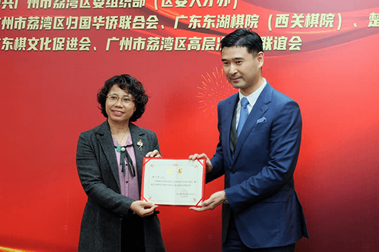 广州市荔湾区侨联主席卜智群向西关棋院容一思院长颁发聘书