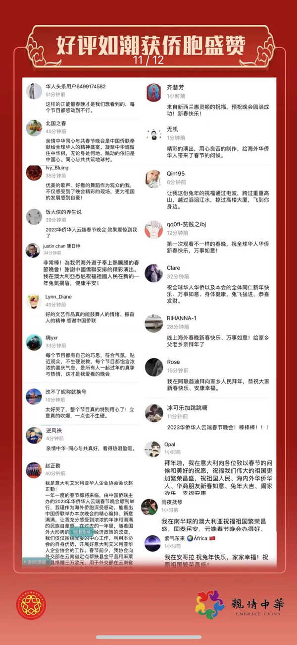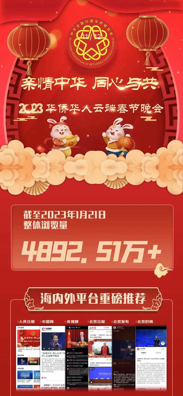 为表达对海外侨胞的惦念,彰显祖(籍)国对侨胞的关爱,由中国侨联主办的2023“亲情中华·同心与共”华侨华人春节晚会于2023年1月19日(腊月廿八)下午4时(北京时间)在各大网络媒体平台同时开播,在海内外侨界引起热烈反响,据统计,截至1月20日16:00,网络观看量累计达 4892.51 万人次。