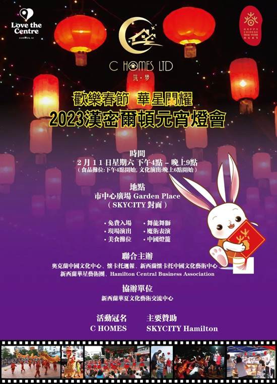 2023年2月11日星期六,由奥克兰中国文化中心、怀卡托周报、怀卡托中国文化艺术中心、新西兰华星艺术团和汉密尔顿市中心商会共同主办,新西兰华夏文化艺术交流中心协办的2023“欢乐春节 · 华星闪耀” 哈密尔顿元宵灯会在哈密尔顿市中心广场(Garden Place)成功举办。