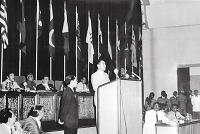 周恩来总理在万隆会议上发言,旁边站立者为浦寿昌。