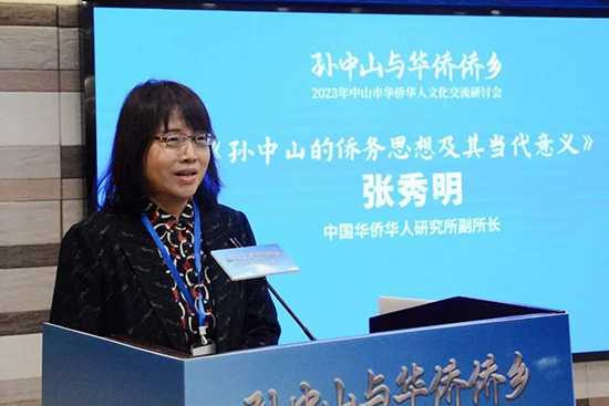 会上中国华侨华人研究所副所长、中国华侨历史学会副会长兼秘书长张秀明作了题为《孙中山的侨务思想及其当代意义》的报告。她表示,“孙中山先生是伟大的民族英雄、伟大的爱国主义者、中国民主革命的伟大先驱。” 他与华侨有着紧密联系与深厚渊源。孙中山开展革命是从海外华侨中开始的,广大爱国华侨是孙中山革命活动强有力的支持者与积极参与者。孙中山高度评价华侨在辛亥革命中的作用和贡献,赞扬“华侨乃革命之母”、“华侨有功革命”。他重视华侨、爱护华侨、把华侨当作中国革命和建设的重要依靠力量。100多年前,中山先生发出了“振兴中华”的呐喊。今天,中国前所未有地接近实现中华民族伟大复兴的目标。在中国革命、建设和改革各个历史时期,海外侨胞做出了重要贡献。在实现中华民族伟大复兴中国梦的新征程中,海外侨胞是重要的推动力量。中山先生和华侨的革命精神是连接海内外中华儿女的共同精神纽带和共有的历史记忆,对进一步构筑新时期海内外中华儿女共有的精神家园,增强海外侨胞的情感认同和文化认同,具有重要意义。