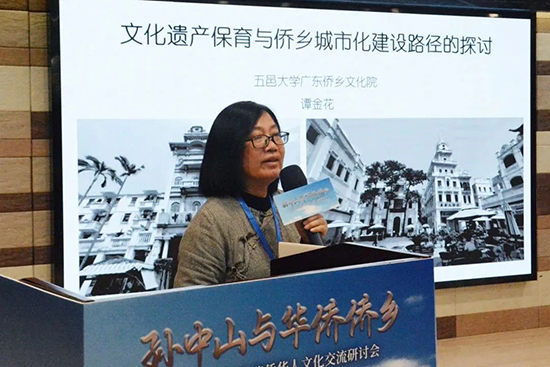 五邑大学广东侨乡文化研究院暨建筑系教授谭金花,作了题为《文化遗产保育与侨乡城市化建设路径的探讨》的报告。她认为,应该厘清文化遗产保育与侨乡城市化建设的关系,厘清文化遗产与社区可持续发展的关系。保护这些文化遗产并不意味着拒绝发展,更非凝固历史、阻止改变,而是在时代变迁的过程中积极应对改变的步伐。在这个过程中应注重完整性、真实性,注重物质和非物质文化遗产的保育,以社区可持续发展为最终目标。