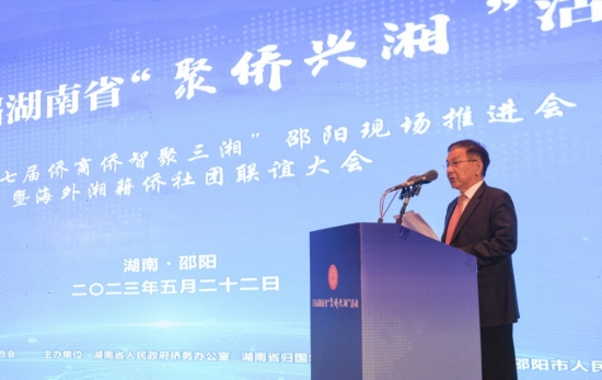 5月22日,由中国侨联指导,湖南省侨办、省侨联、邵阳市委、市政府主办的首届湖南省“聚侨兴湘”活动——“第七届侨商侨智聚三湘”邵阳现场推介会暨海外湘籍侨社团联谊大会在邵阳市举行。中国侨联顾问王永乐、省委统战部副部长向恩明出席并致辞。湖南省侨联党组书记、副主席孙民生主持会议。邵阳市委书记严华出席。来自58个国家和地区的海外侨社团(机构)及侨商代表等齐聚一堂,助力湖南高质量发展。