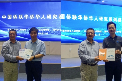 讲座结束后,清华大学华商研究中心主任龙登高教授分别向中国华侨华人研究所、中国华侨历史博物馆赠送了相关书籍。