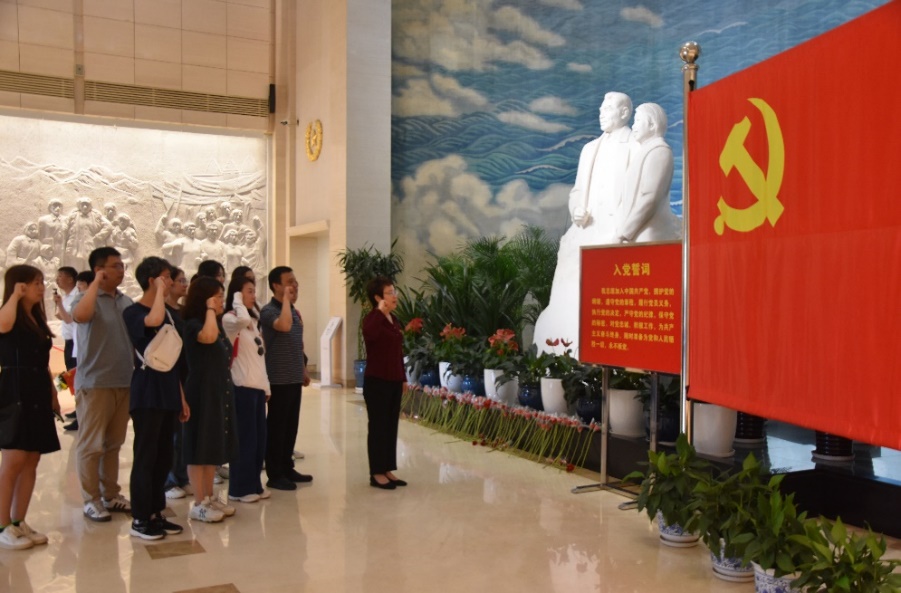 党员干部在纪念馆大厅列队站立,面向党旗重温入党誓词。