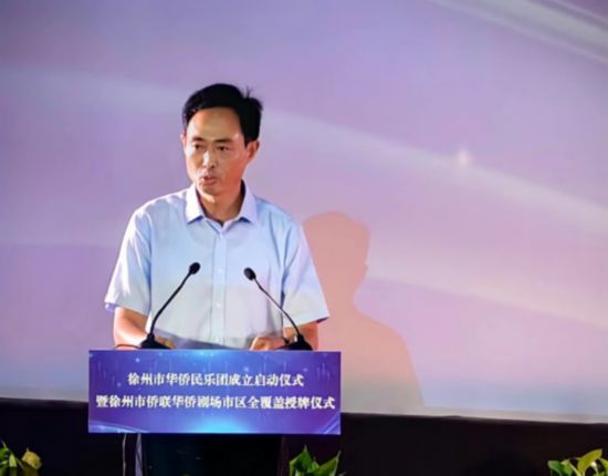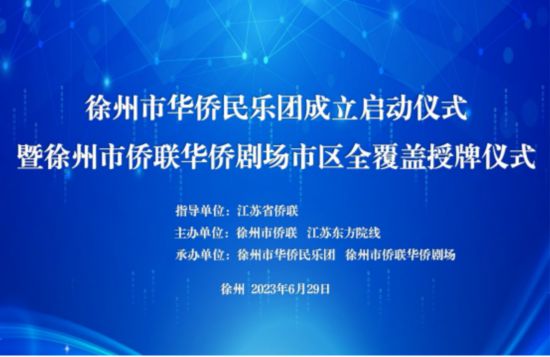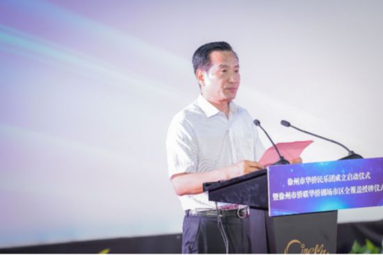 仲夏时节,万物丰茂。6月29日下午,伴着民族音乐的优美旋律,徐州市侨联在中影东方影城绿地世纪城店市侨联华侨剧场隆重举行徐州市华侨民乐团成立揭牌暨市侨联华侨剧场主城区全覆盖授牌仪式。江苏省侨联党组成员、副主席艾卉出席仪式并讲话,徐州市人大原副主任、市二胡学会会长徐崇先,徐州市侨联党组书记刘广昕,江苏东方院线副总经理刘爱进,市政协港澳台侨(外事)委员会主任王黎明,致公党徐州市委专职副主委李志国,市级机关工会工作委员会主任张嘉星等领导参加了仪式。