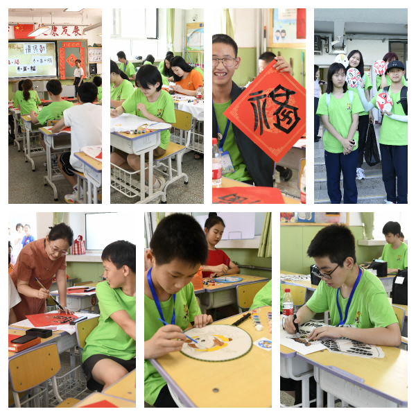 伴随着优雅的古琴乐,美术教师和小同学们为营员们讲解了脸谱、团扇、对联、风筝等的基本知识、寓意、内涵,并带领大家亲手绘制、书写。营员们体验了中国传统书画丰富多彩的表现形式,小解说员和老师们的讲解为他们带来了一场传统文化知识的盛宴,让这些生长在异国的孩子们全方位感受了中华的传统文化的艺术魅力和丰富的文化内涵。