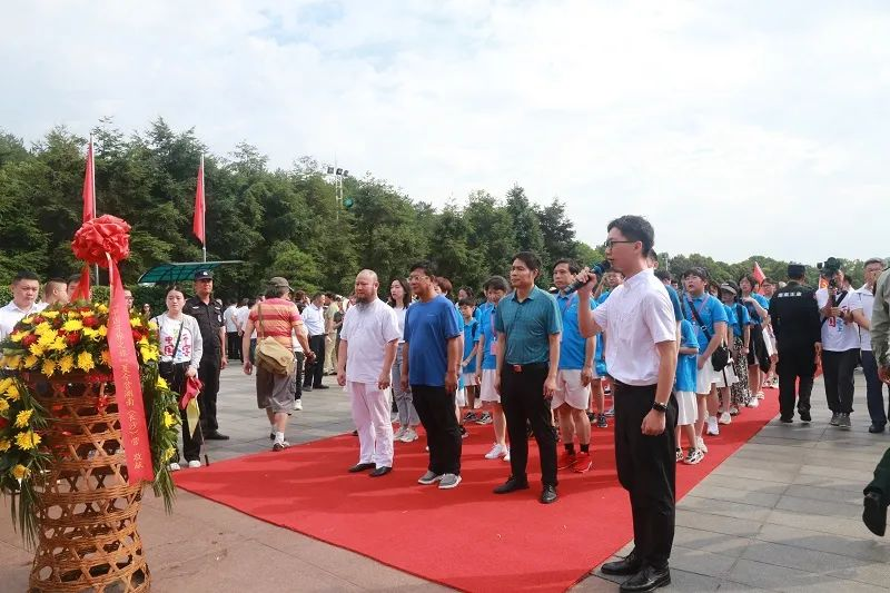 广场上人流如织,营员们紧随两位警卫战士抬起的花篮,在庄严的曲声中缓步前行。湖南省侨联、湘潭市侨联、韶山市侨联以及湖南省宋旦汉字艺术博物馆的负责人也走在队伍中。走上广场西端的台阶,将花篮放置在毛主席铜像前,全体营员三鞠躬,绕铜像一周步行后,表达对伟人的崇敬与缅怀。