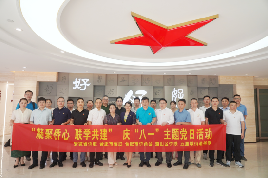 为庆祝中国人民解放军建军96周年,8月1日上午,安徽省侨联组织党员到合肥市蜀山区五里墩街道开展主题党日暨庆“八一”活动,参观红色口述史馆、蜀山好人馆,聆听老兵讲述英雄故事。省侨联党组成员、秘书长刘君,合肥市侨联党组成员、副主席马晓梅,省侨联、合肥市侨联机关党员干部,省、市侨商会党员代表,蜀山区侨联、五里墩街道相关负责人等参加活动。