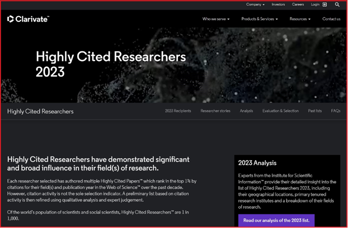 每年,Clarivate™都会评选出在各自领域具有显著和广泛影响力的全球研究科学家和社会科学家。这一精英群体在推动知识前沿、带来创新,促进世界更加健康、更加可持续和更加安全等方面贡献卓越,被选中的研究人员是基于他们在过去十年中在Web of Science中发表了多篇高被引论文™,即在其领域和发表年度中被引用排名前1%的论文。