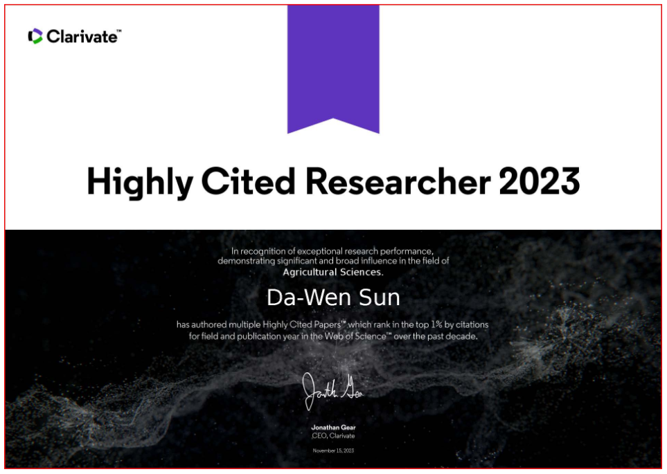 近日科睿唯安(Clarivate Analytic)发布最新数据,爱尔兰都柏林大学(UCD)/华南理工大学孙大文院士(Da-Wen Sun)被评为“2023年高被引科学家”。这是孙大文院士连续9年跻身全球最具影响力的研究人员行列(Highly Cited: Professor Da-Wen Sun features for ninth time in global list of most influential researchers - University College Dublin (ucd.ie)),创下了获得这一殊荣次数的新纪录,标志着孙大文院士卓越职业生涯中的新里程碑。这一荣誉也进一步说明他长期对全球农业科学领域的杰出贡献及深远影响。