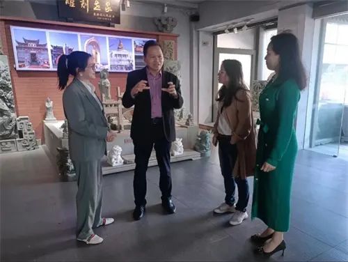 在旭宏集团泉州大观雕艺有限公司(前身是创建于1996年的惠安艺苑雕刻),调研组实地考察了企业的研学中心、影雕制作工作室、作品展示馆等,并与企业负责人——福建省非物质文化遗产传承人、福建省工艺美术大师蒋清兰深入探讨了华侨文化交流基地建设和特色产业扶持等问题。