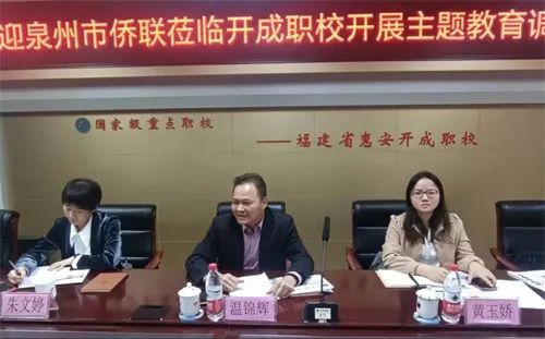 在开成职校的会议室,调研组结合侨联工作实际,与惠安县侨联、东桥镇侨联以及开成职校的领导和老师们座谈交流。