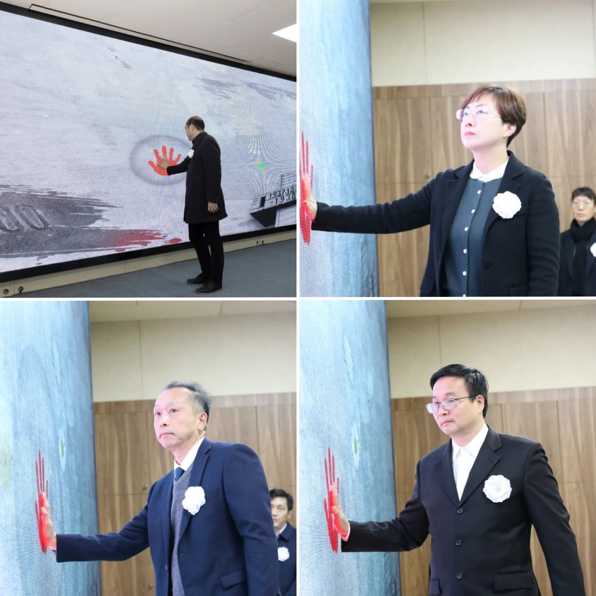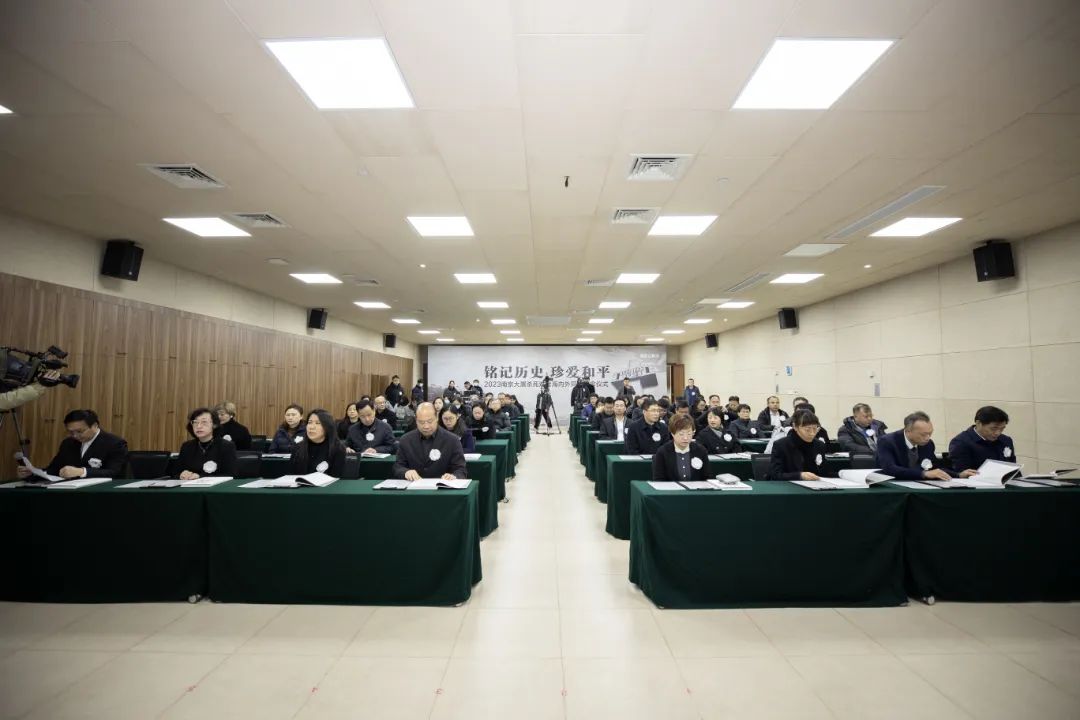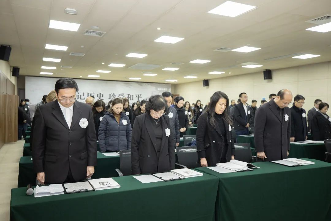 参加主会场悼念仪式的代表们胸带白花,默然肃立,向南京大屠杀死难者默哀。“龙蟠虎踞,彝训鼎铭,继往开来,永志不忘!”默哀毕,主会场及分会场参与人员齐诵《和平宣言》。随后,代表们秉菊怀殇,向南京大屠杀死难者献花,并参观南京大屠杀史实展——《人类的浩劫:1937南京大屠杀》。