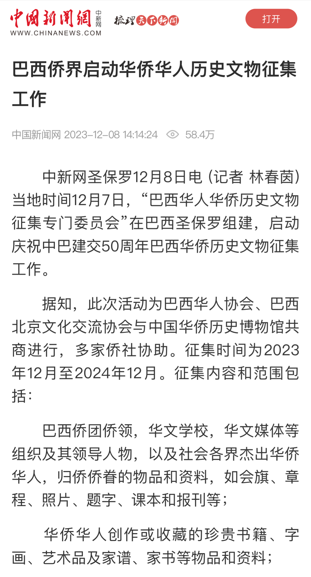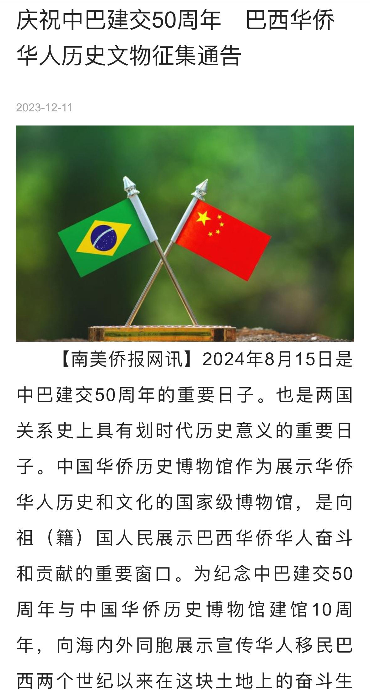 为纪念即将到来的中巴建交50周年,向海内外同胞展示宣传华侨华人移民巴西两个世纪以来的奋斗经历,回馈当地社会并促进两国人民友好往来所作出的贡献努力,中国华侨历史博物馆、巴西华人协会、巴西北京文化交流协会经协商决定共同开展巴西华侨华人历史文物征集工作。