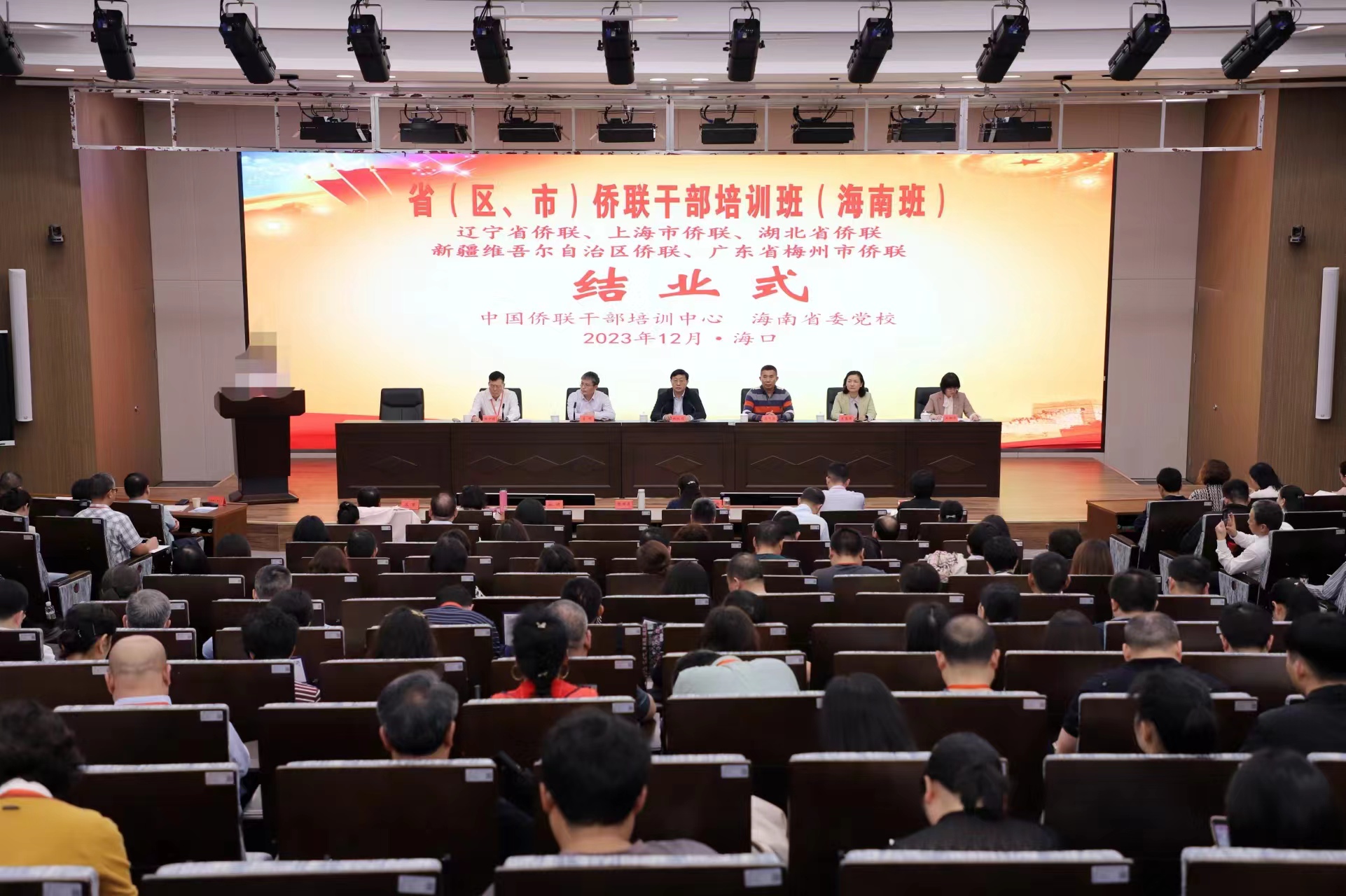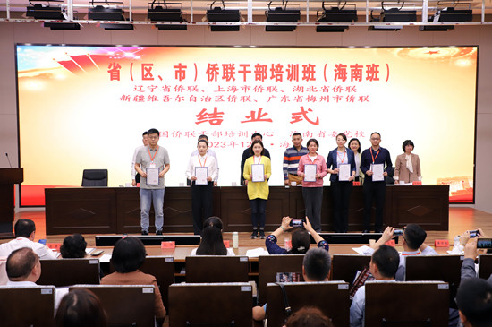 本期培训班由中国侨联干部培训中心、辽宁省侨联、上海市侨联、湖北省侨联、新疆维吾尔自治区侨联、广东省梅州市侨联以及海南省委党校共同举办。辽宁省侨联党组成员、副主席崔明,湖北省侨联党组成员、副主席王慧萍,新疆维吾尔自治区侨联兼职副主席陈少钦,梅州市侨联党组成员、副主席王映萍出席结业式,来自五省(区、市)侨联的213名侨联干部参训学习。